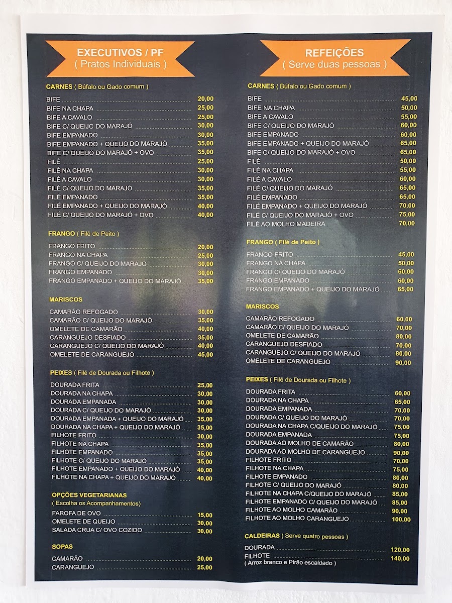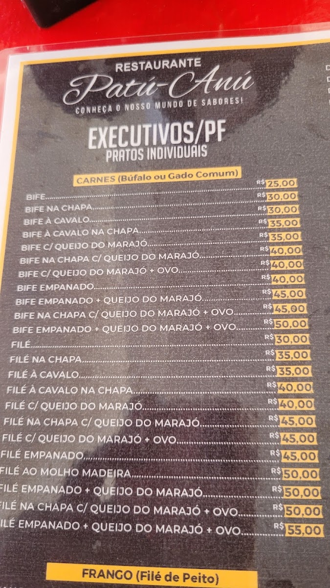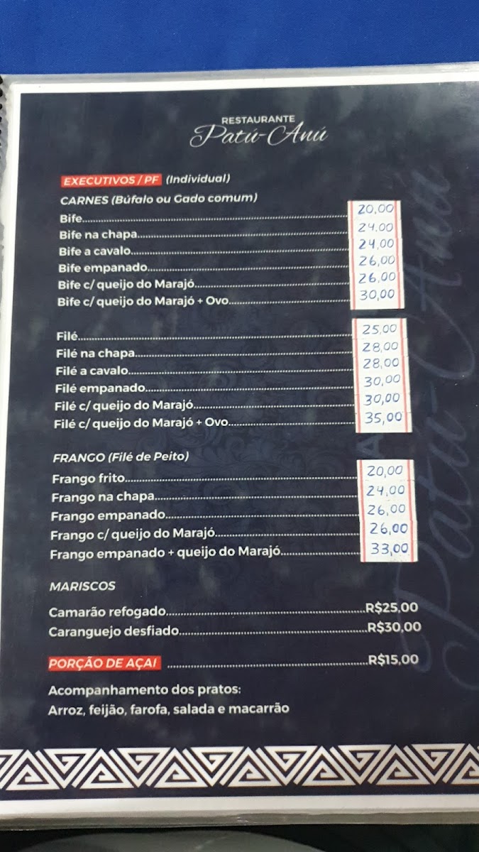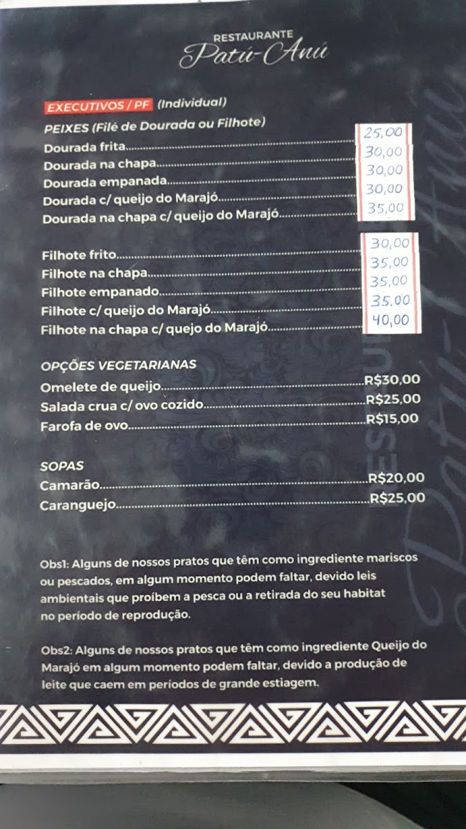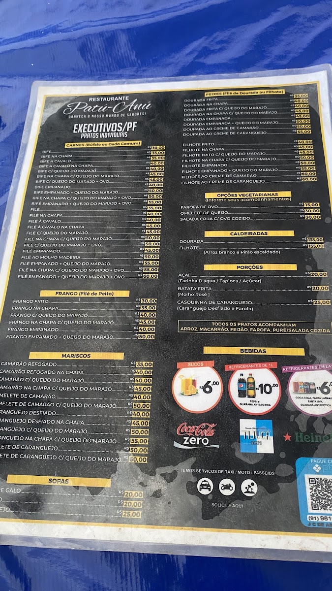The menu at Restaurante Patú-Anú in Soure, Brazil, offers a delightful array of traditional and flavorful dishes that showcase the region's rich culinary heritage. Among the standout options is the Filé Marajoara, a savory beef fillet that embodies the unique flavors of the Marajó region. Another must-try is the PF Filé de Búfalo Com Queijo Marajoara, which combines tender buffalo steak with the creamy richness of Marajó cheese, delivering a perfect balance of textures and flavors.
