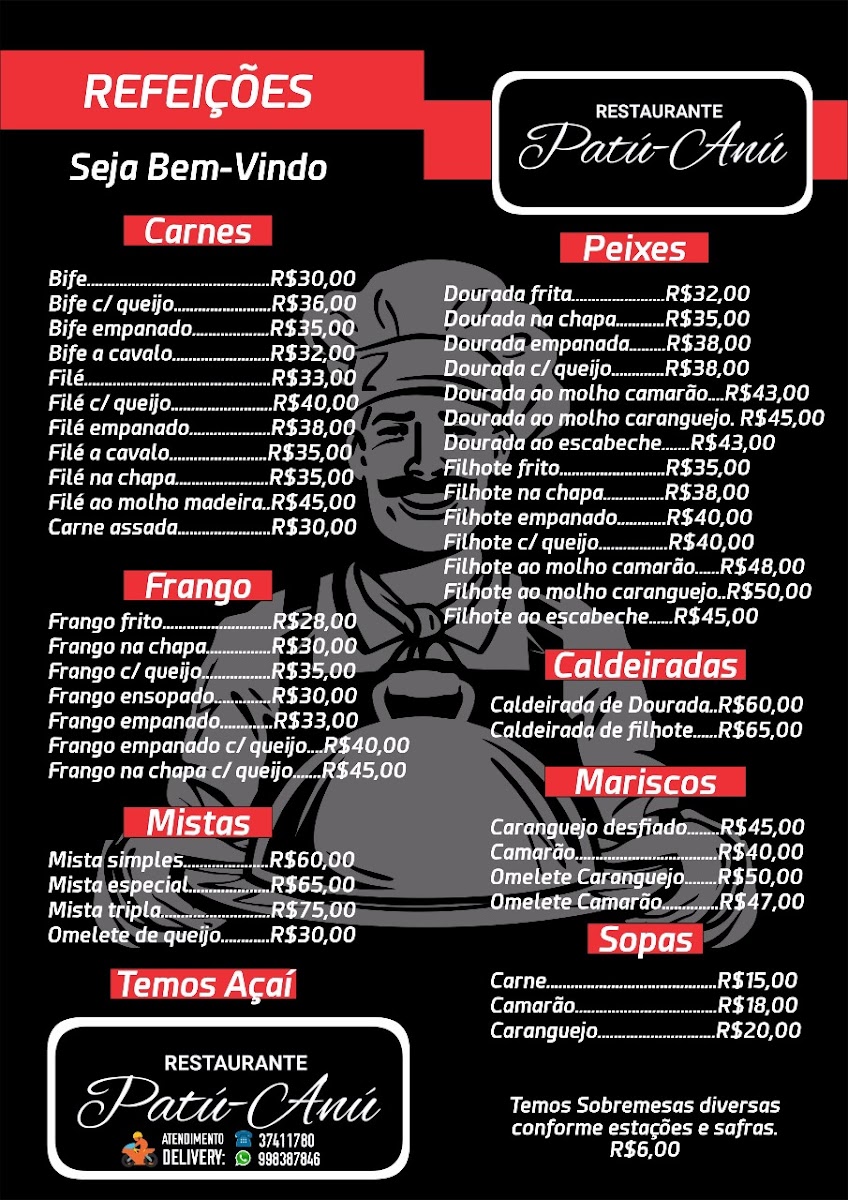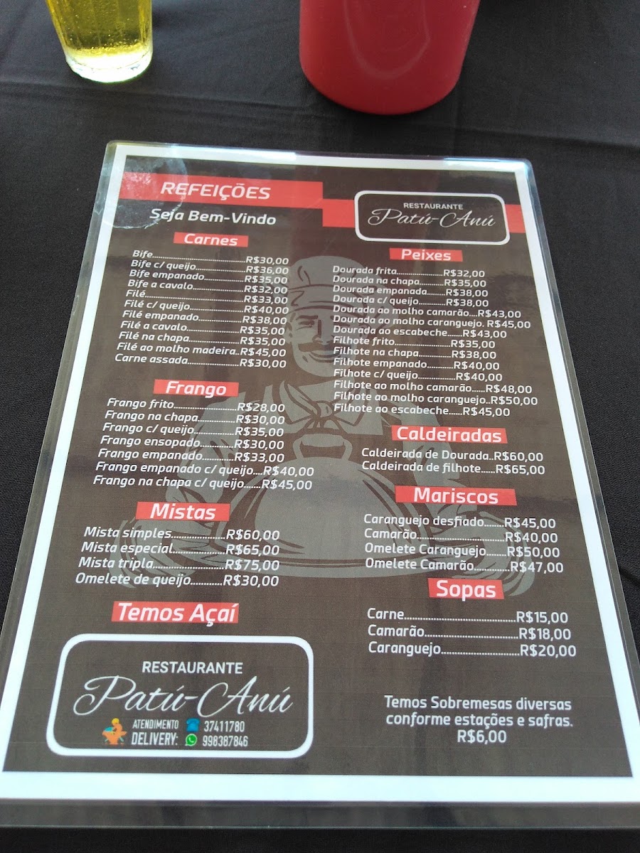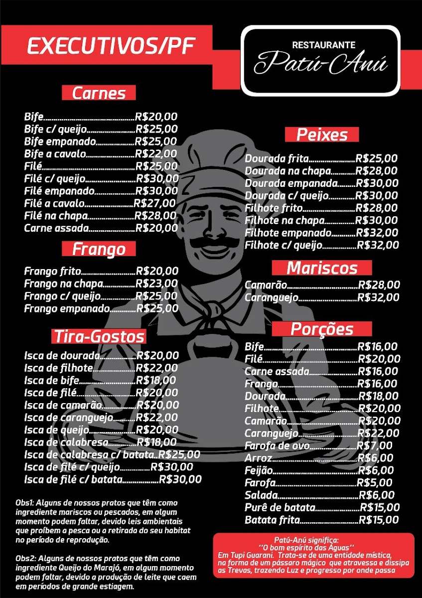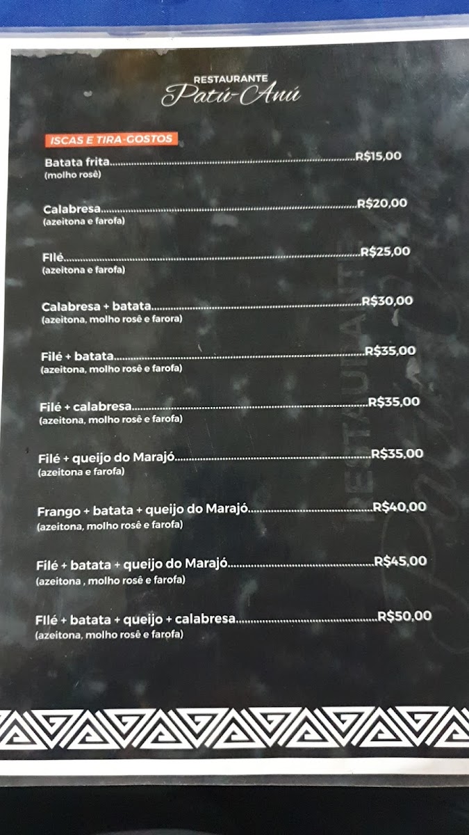 Lastly, the PF Filhote Na Chapa is a grilled fish dish served in a traditional Brazilian style, highlighting the fresh and natural flavors of local seafood. With a variety of meats and seafood options, Restaurante Patú-Anú’s menu offers something for every palate, each dish thoughtfully crafted to showcase the best of the region's flavors and ingredients.